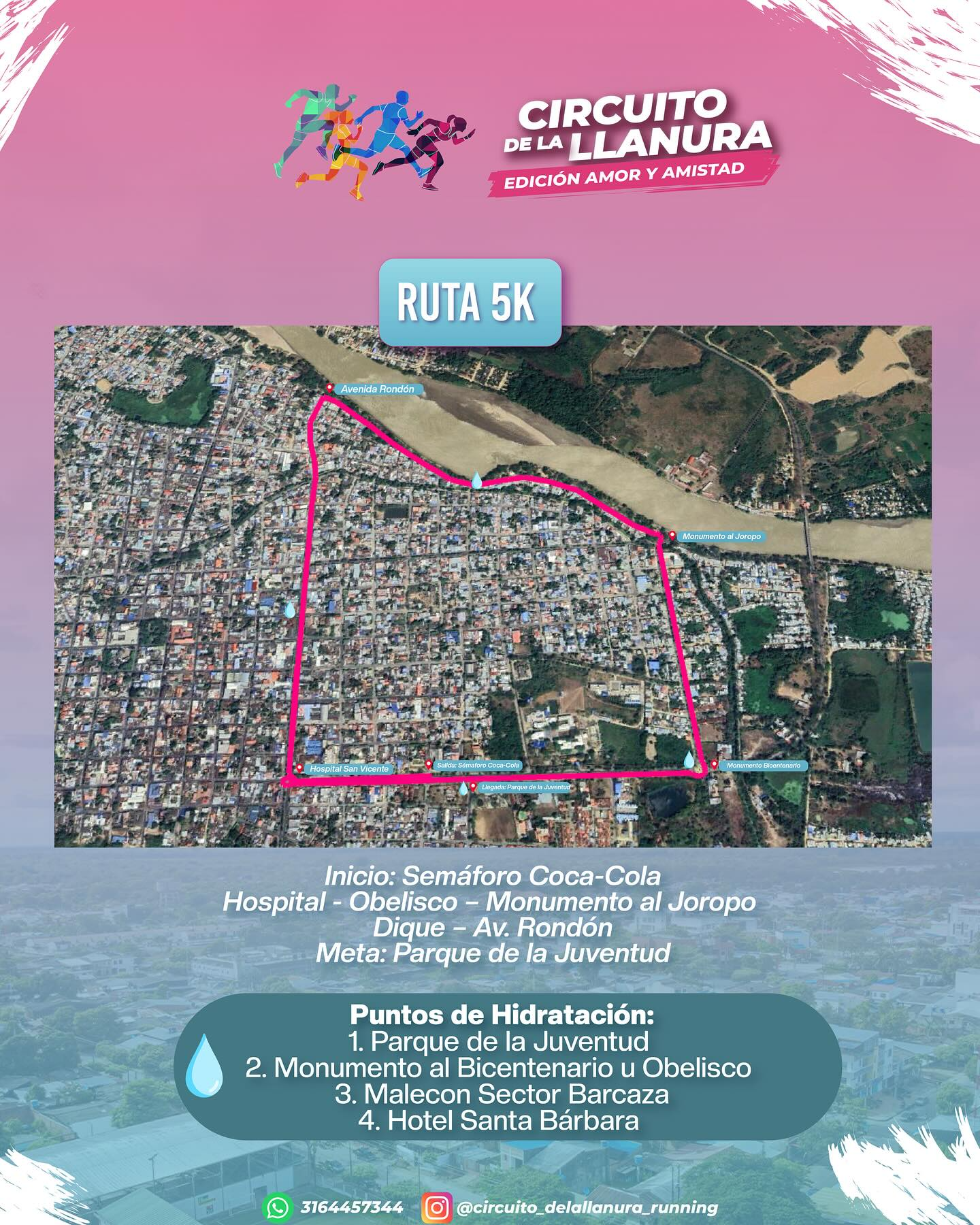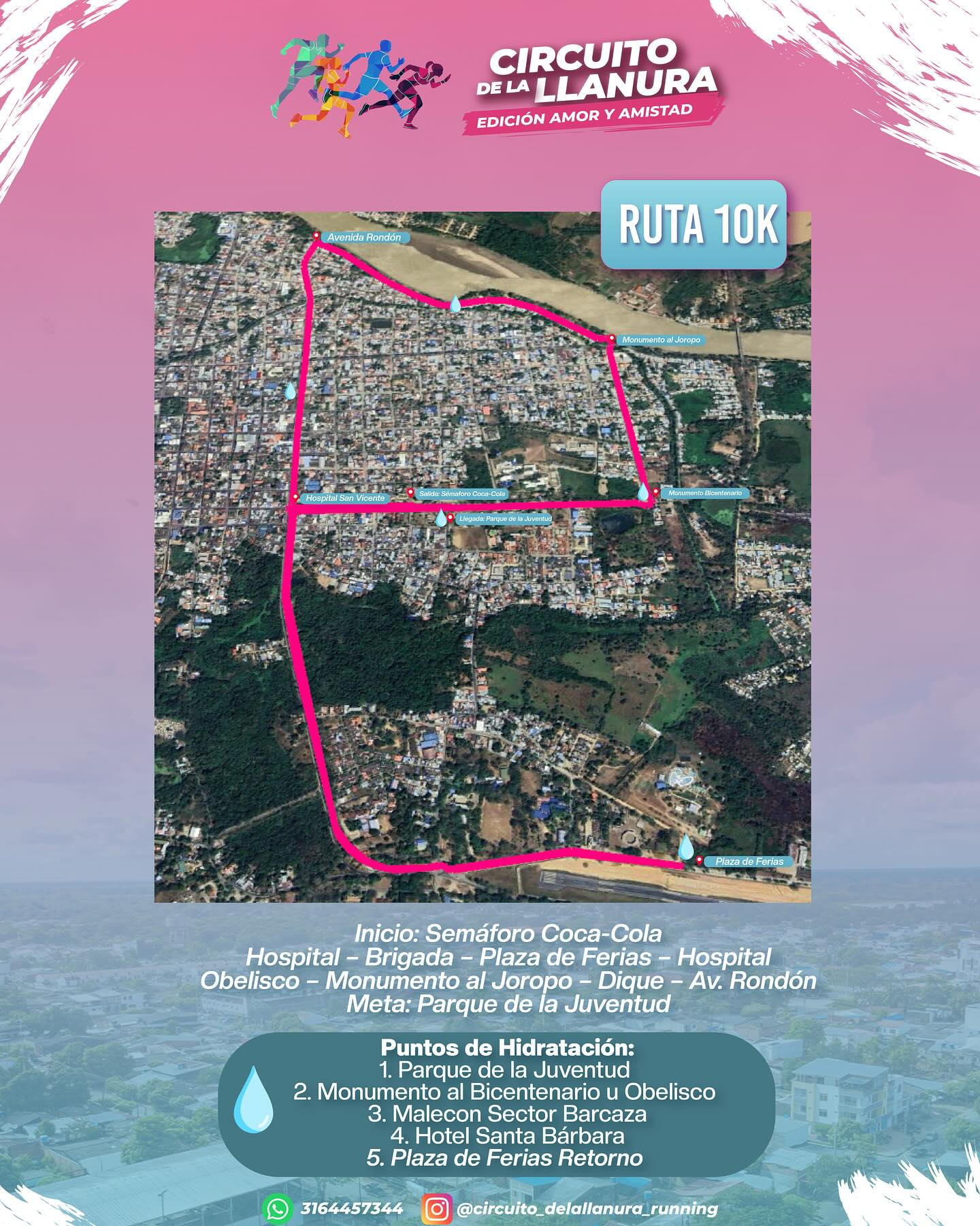 La ruta de 10K partirá desde el semáforo de Coca-Cola, pasará por el Hospital San Vicente, la Brigada 18, el Centro Recreacional Los Araguatos, el Obelisco, el Malecón, la Avenida Rondón y finalizará en el Parque de la Juventud.